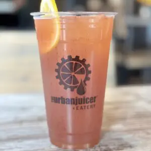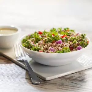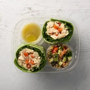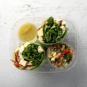 Spinach, tomatoes, Havarti cheese, and UJ super chicken. Served on a spinach wrap with a side of quinoa salad