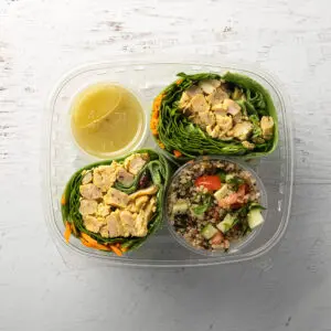 Spinach, carrots, and curry chicken. Served on a spinach wrap with a side of quinoa salad