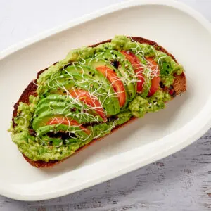 fresh whole avocado, cherry tomatoes and dressed arugula on Great Harvest sunflower bread (V)