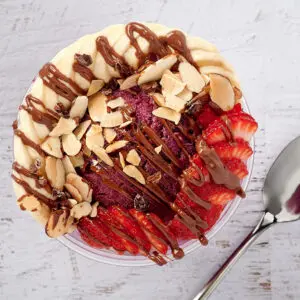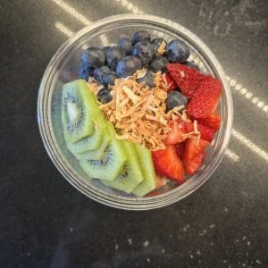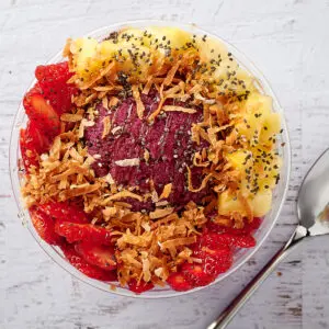 Acai base, kiwis, blueberries, strawberries, coconut cream, toasted coconut