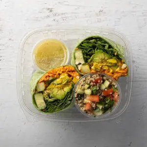 Spinach, avocado, carrots, cucumber, sprouts, red peppers, hummus, feta cheese and turmeric date dressing. Served on a spinach wrap with a side of quinoa salad