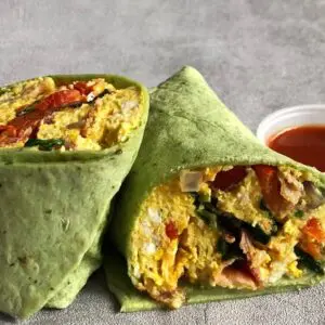 Scrambled eggs, Boar’s Head bacon, cheddar, onion, peppers, tomatoes on a spinach wrap. Served with side of sriracha