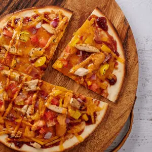 BBQ sauce, cheddar cheese, grilled chicken, bacon, red onion, Roma tomatoes, bell peppers and a chipotle aioli on a gluten-free cauliflower crust