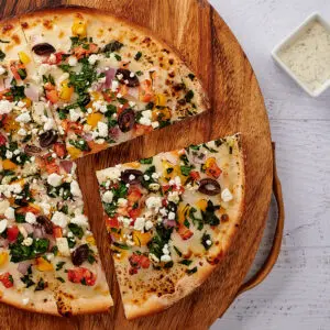 Olive oil, mozzarella cheese, feta cheese, Roma tomatoes, bell peppers, olives, spinach and a lemon aioli on a gluten-free cauliflower crust