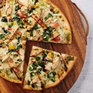 Pesto, mozzarella cheese, grilled chicken, Roma tomatoes, bell peppers, spinach and a balsamic glaze on a gluten-free cauliflower crust