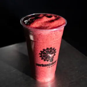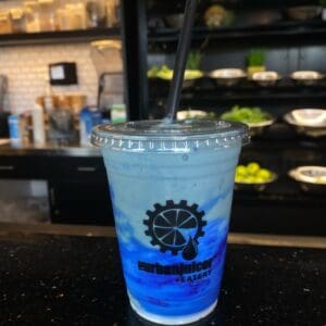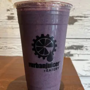 Mango, banana, avocado, almond milk, almond butter, coconut cream, vanilla syrup, blue spirulina, collagen