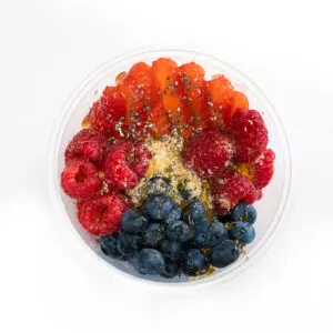 strawberries, blueberries, raspberries, flax, chia, honey (GF)
