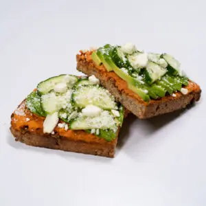 house-made hummus, avocado, english cucumber, sprouts, feta, lemon, Krazy Jane's seasoning on sunflower bread