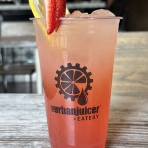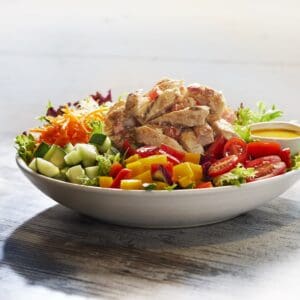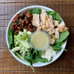 Grilled chicken, spinach, arugula, strawberry, apple, feta, almonds, chia seeds, UJ vinaigrette