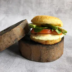 Farm fresh egg, sliced tomato, spinach and avocado on an English muffin (GF)