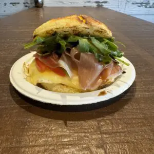 Fried egg, havarti, prosciutto, tomato, arugula, balsamic on a gluten-free English muffin