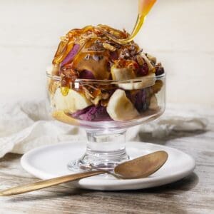 banana, granola (*contains tree-nuts*), cacao nibs, almond butter, bee pollen and honey (GF)