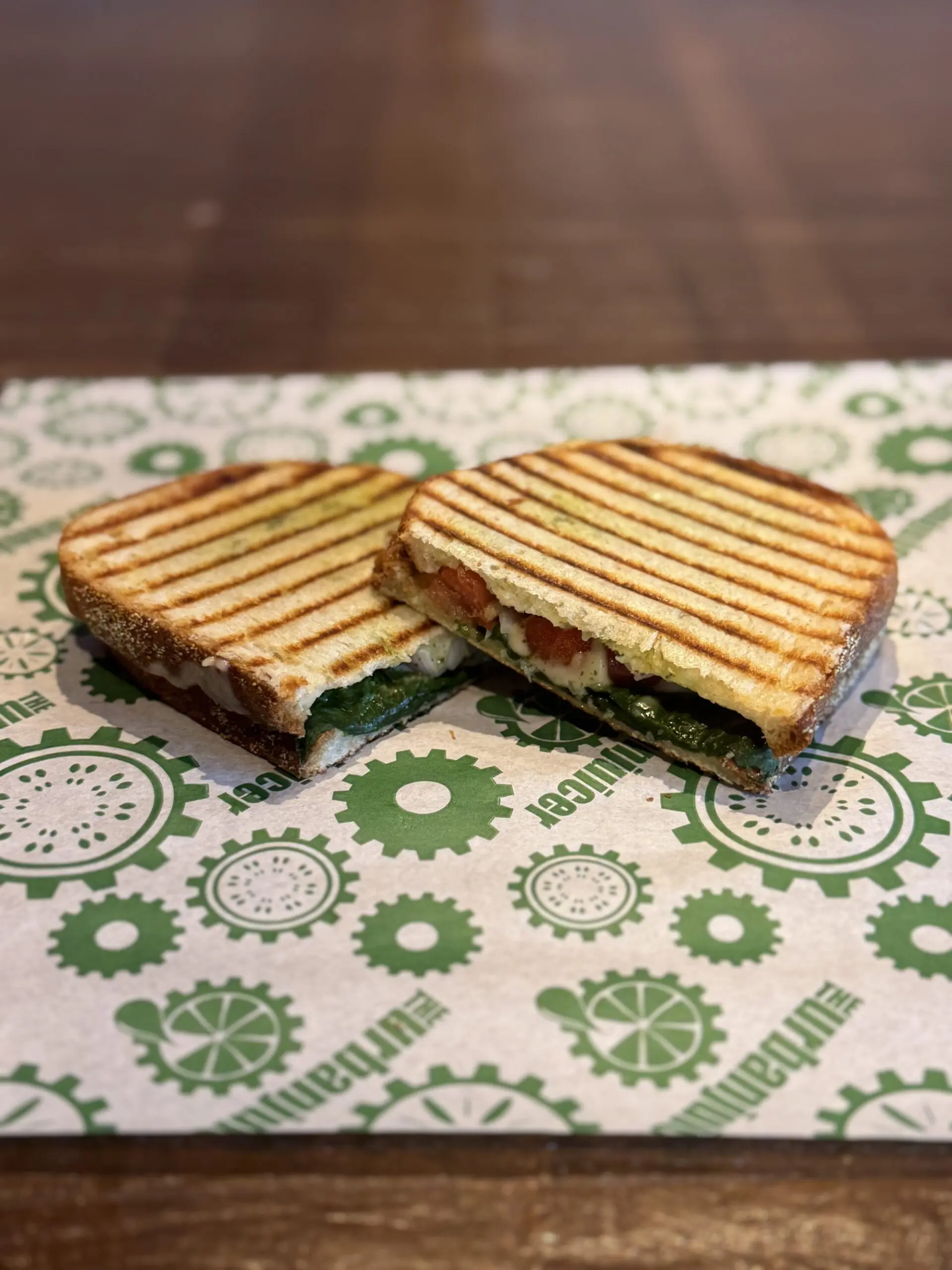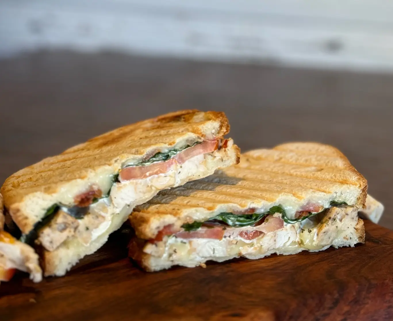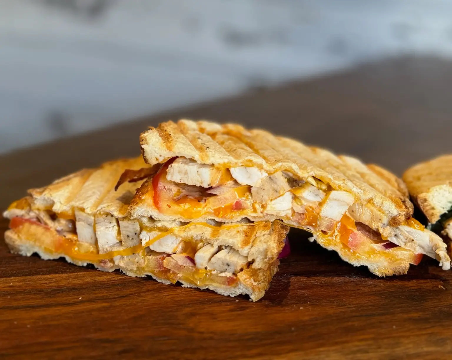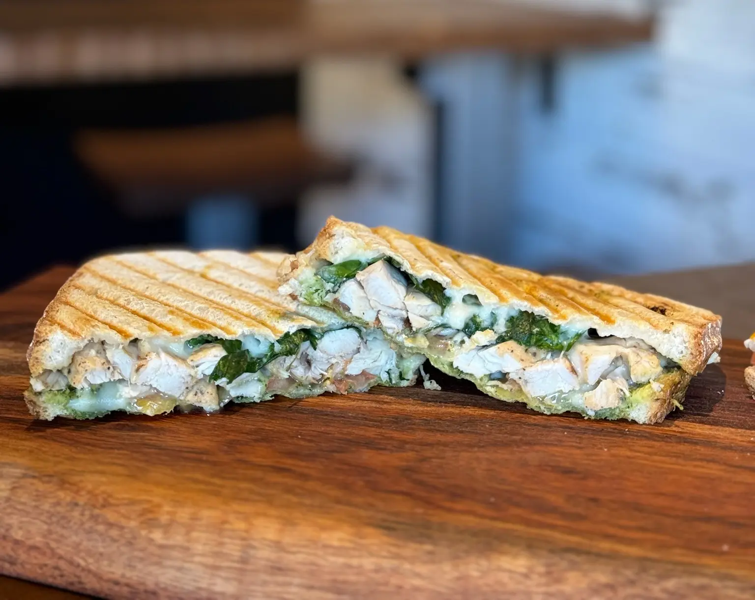 Grilled chicken, melty mozzarella, fresh spinach, and house-made pesto pressed between crispy whole-grain bread.…