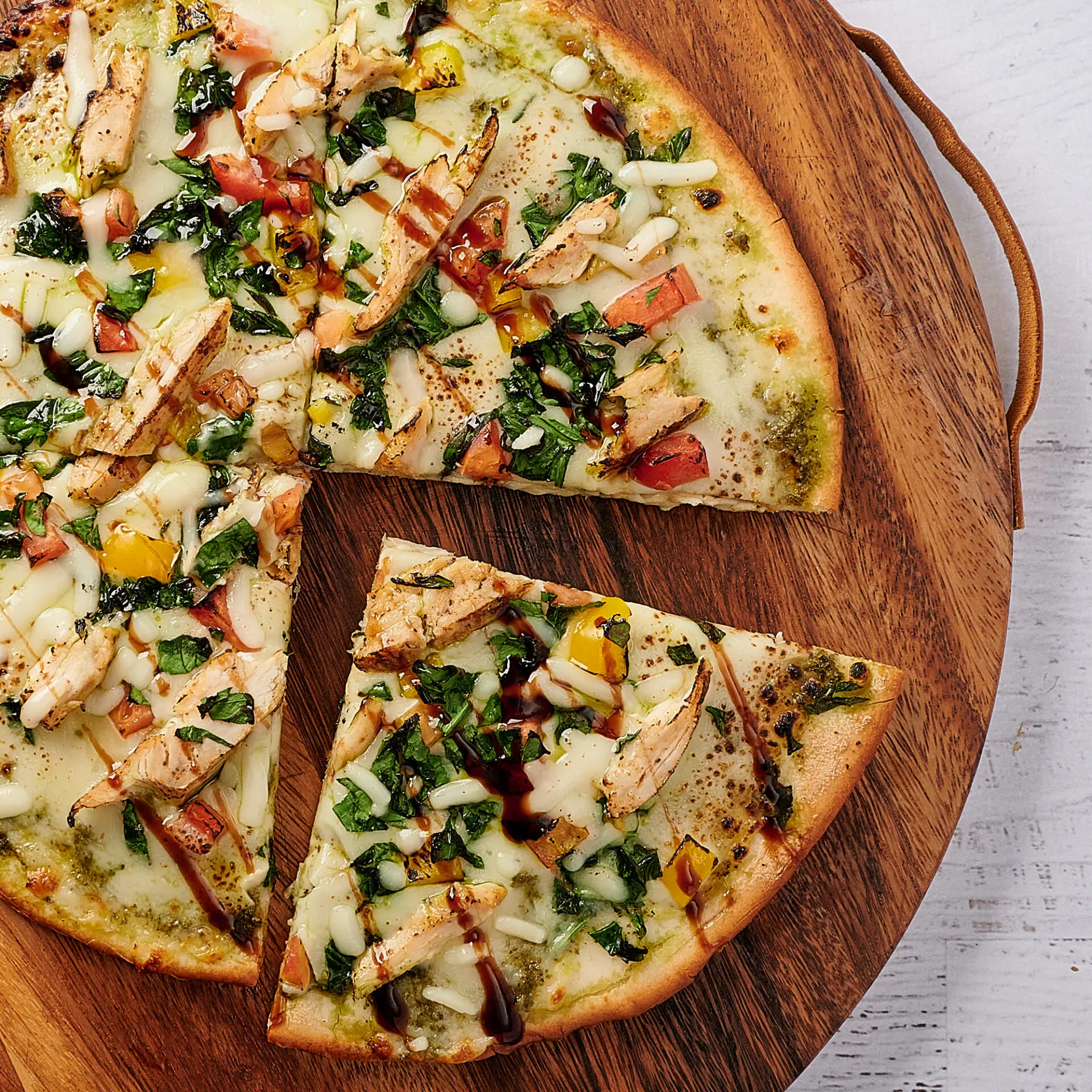 BBQ sauce, cheddar cheese, grilled chicken, bacon, red onion, Roma tomatoes, bell peppers and…