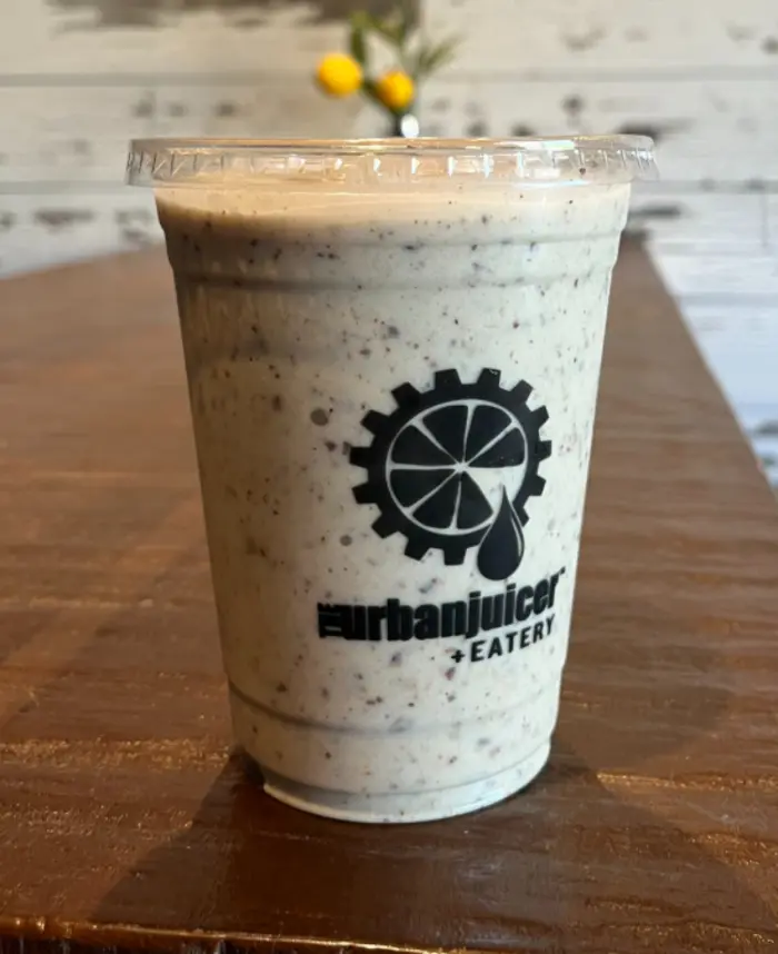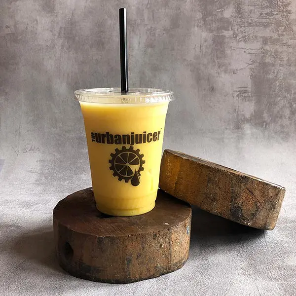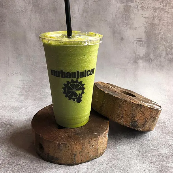 The Bee Green smoothie from The Urban Juicer is a refreshing blend of kale, spinach, coconut water, pineapple, mango, honey, bee pollen, and orange juice, offering a nutrient-rich boost to energize your day.
