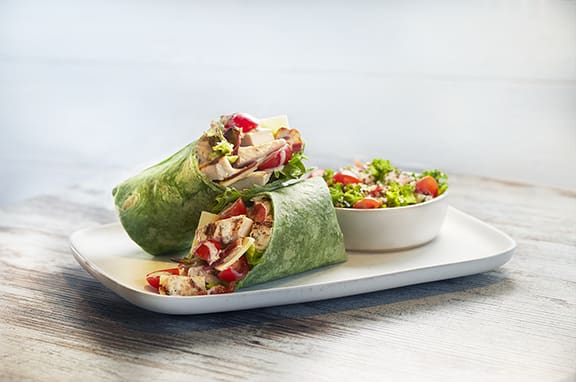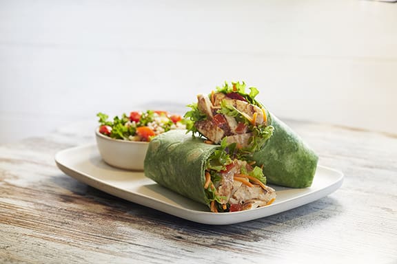 Grilled chicken, Boar’s Head bacon, Roma tomatoes, Havarti cheese, spinach and house-made lemon-aioli. Served on a spinach wrap with a side quinoa salad
