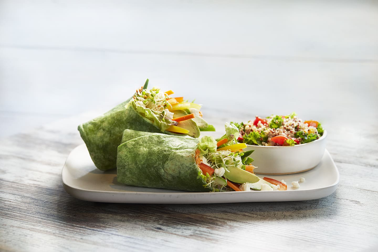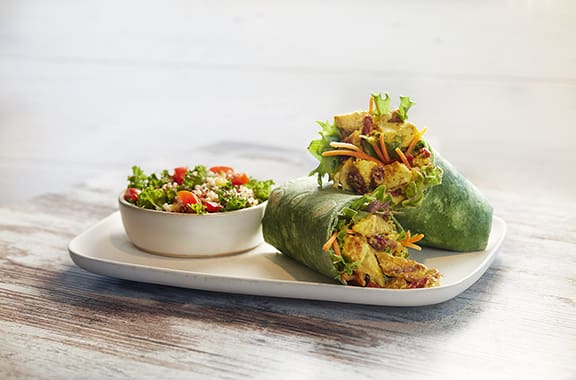 Savor healthy food with The Urban Juicer's Chicken Club Wrap—featuring grilled chicken, Boar’s Head bacon, Roma tomatoes, Havarti cheese, spinach, and house-made lemon aioli on a spinach wrap, served alongside a quinoa salad.