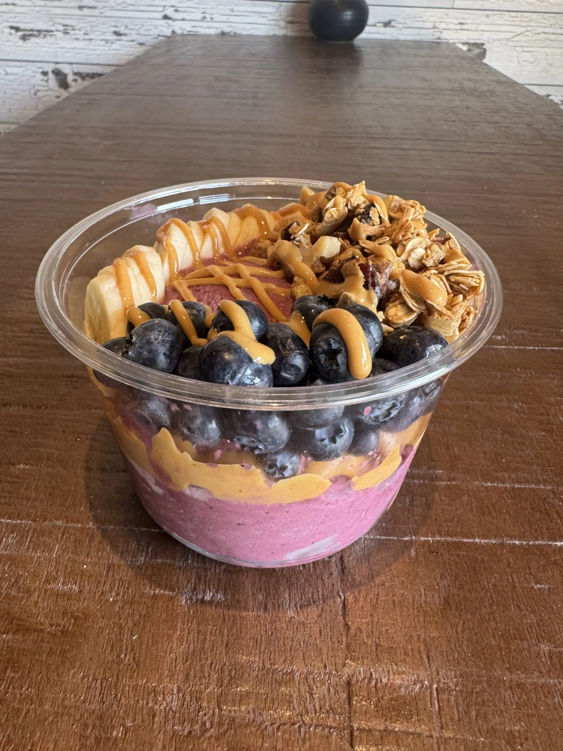 Looking for Nashville gluten-free food? Try our Peanut Butter Bowl Acai Bowl, featuring peanut butter, granola, banana, blueberries at The Urban Juicer, loaded with fresh, wholesome ingredients for a healthy boost!