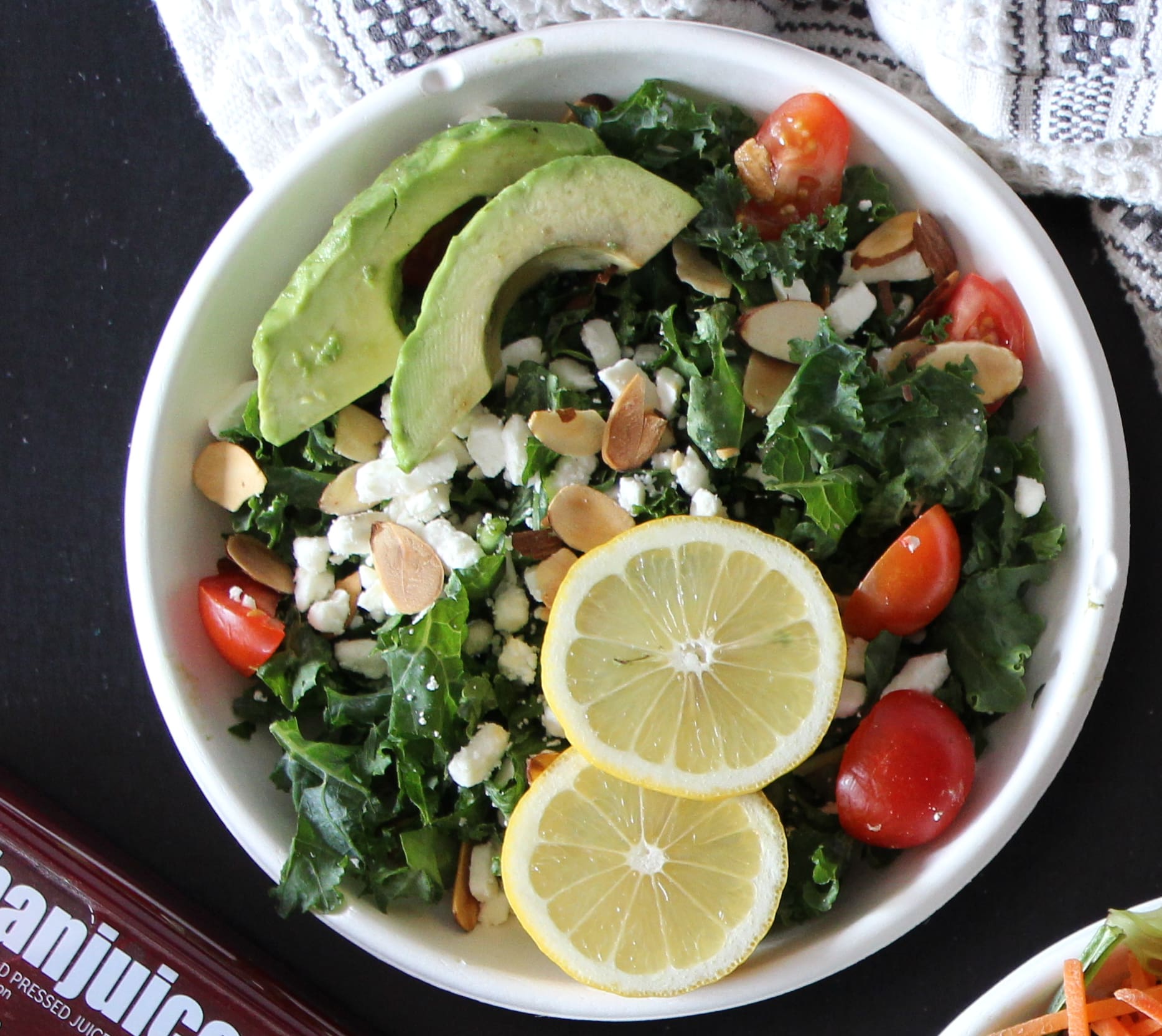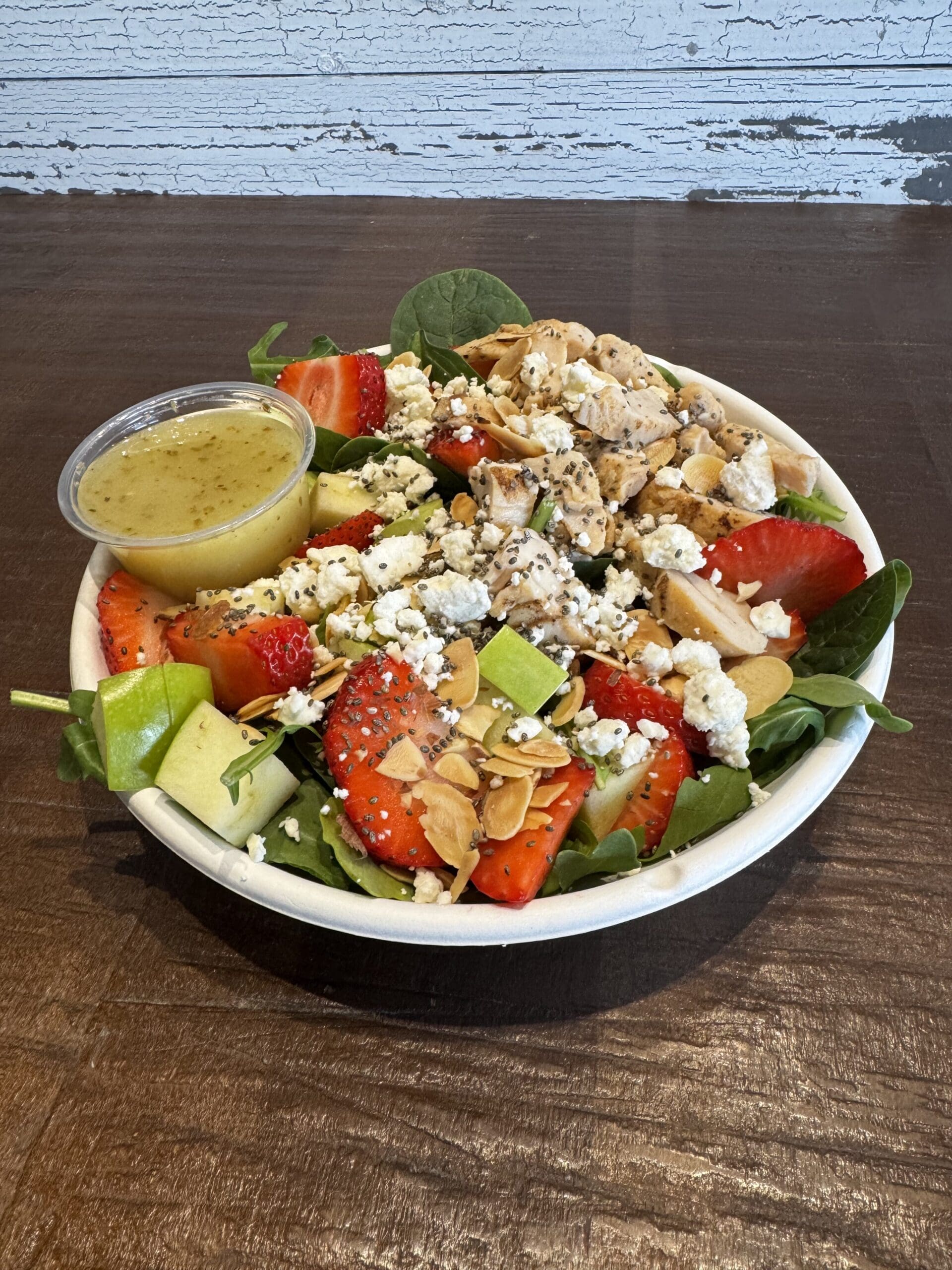 Grilled chicken, spinach, arugula, strawberry, apple, feta, almonds, chia seeds, UJ vinaigrette