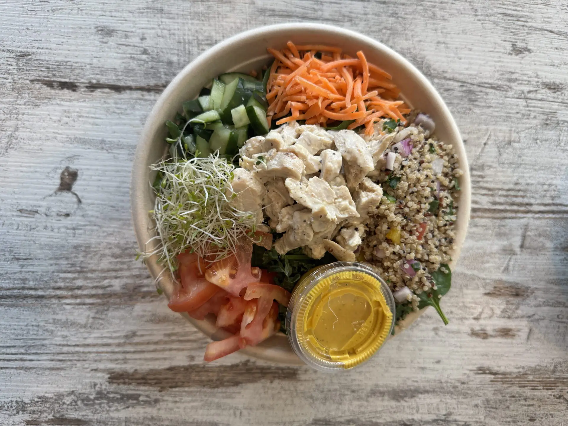 Spinach, chopped kale, UJ super chicken, quinoa, carrots, tomatoes, cucumber, sprouts, house-made UJ turmeric date dressing
